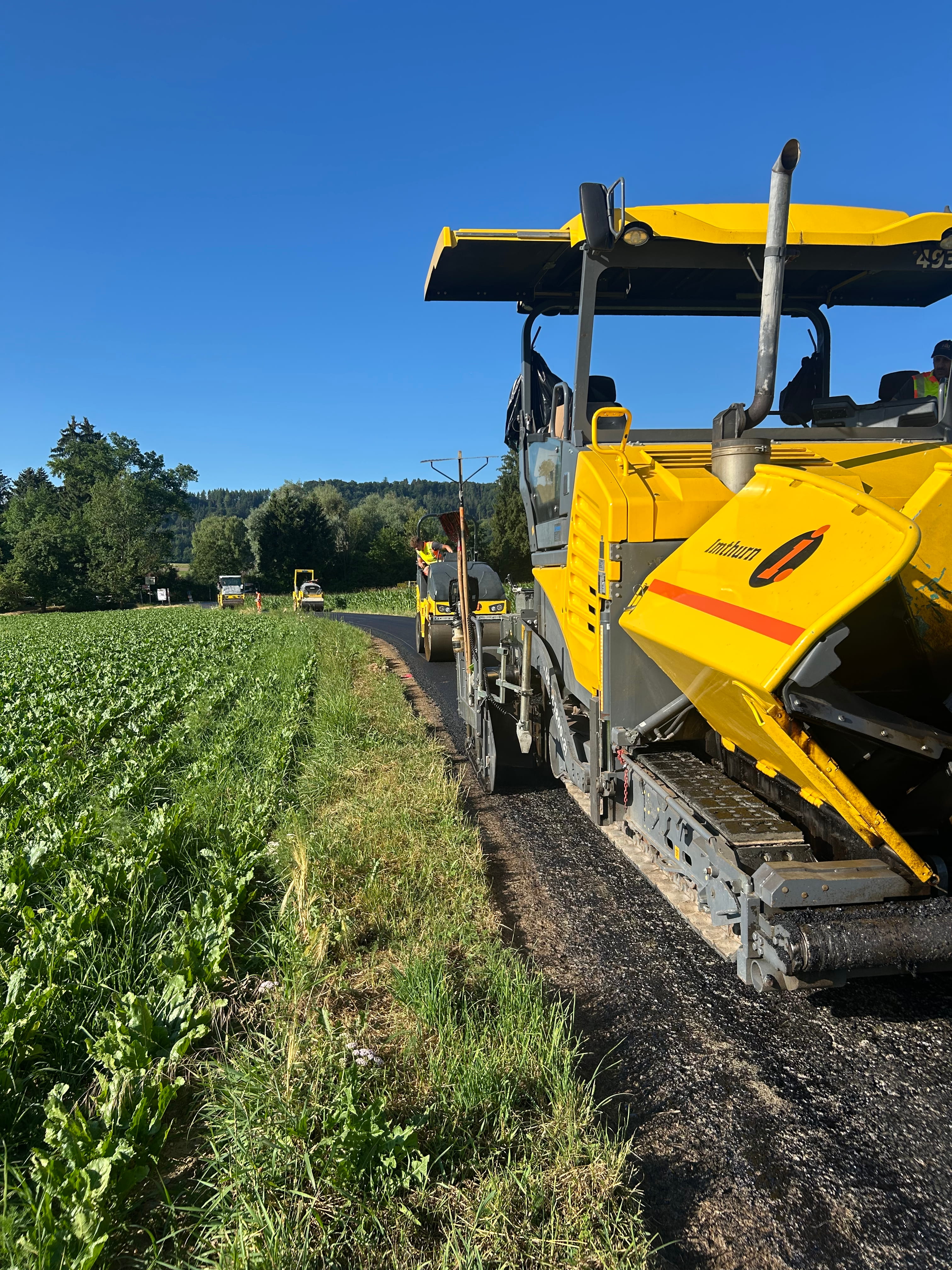 Im Sommer haben wir für den Tiefbau Schaffhausen das Projekt Radweg „Bibermühle“ erfolgreich umgesetzt. Dabei sanierten wir die bestehende Straße auf einer Länge von rund 2'200 Metern umfassend. Zu Beginn wurden die Straßenränder hergestellt, Setzungen gefräst und neu eingebaut sowie kleinere Schadstellen geschiftet. Zudem setzten wir sämtliche Schachtabdeckungen neu und brachten anschließend den Haftvermittler auf. Im nächsten Schritt erfolgte der Einbau von rund 1.180 Tonnen AC TDS 16N, verteilt über zwei Arbeitstage. Abschliessend stellten wir das Bankett maschinell her und führten sämtliche notwendigen Anpassungsarbeiten aus.