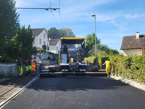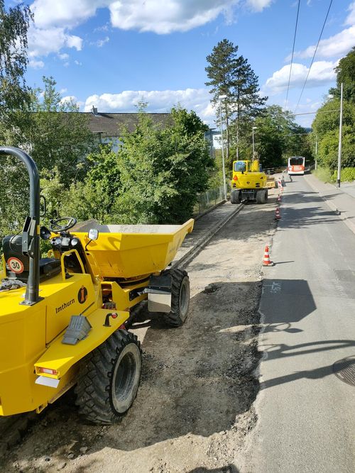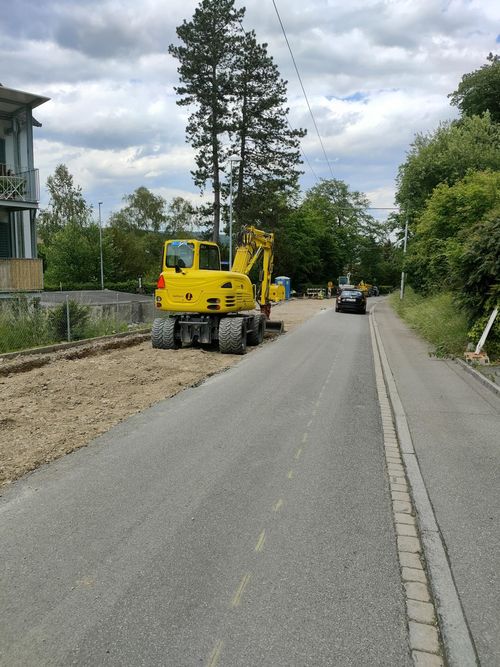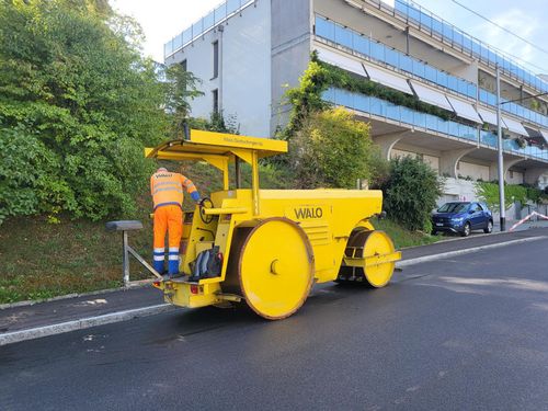 Die Sanierung der Buchenstrasse in Schaffhausen durften wir im Sommer 2022 für Tiefbau Schaffhausen ausführen. Die Strassenentwässerung wurde erneuert und an die zuvor neu erstellte Kanalisation angehängt. Der Gehweg «nordseitig» wurde rückgebaut, der Gehweg «südseitig» behindertengerecht ausgebaut. Aufgrund der Scheitelpunktverschiebung des Dachgefälles musste die Tragschicht und die Strassenfundation komplett ersetzt werden. Zur Verkehrsberuhigung wurden zwei Grünflächen erstellt. Die Arbeiten wurden bis und mit Trag-schicht in zwei Etappen aufgeteilt. Der Deckbelagseinbau fand innerhalb einer Vollsperrung statt. Zum Lärmschutz wurde ein SDA-Belag eingebaut. Der SDA-4-Belag führt zu einer deutlichen Lärmminderung, was seiner feinen Oberflächenstruktur mit Gesteinskörnern von maximal 4 Millimetern Grösse und einem hohen Hohlraumgehalt von mindestens 12 Volumenprozent zu verdanken ist.